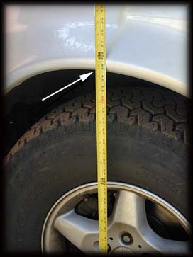 Make sure the vehicle is positioned on true level ground (concrete floor) and measure during torsion bar adjustment the height from the floor to the inside of the fender well (the adjustment bumped the measurement from 33.7" to 34.5" on my vehicle in combination with 265/75 R 16 tires) Both sides need to be of equal height.