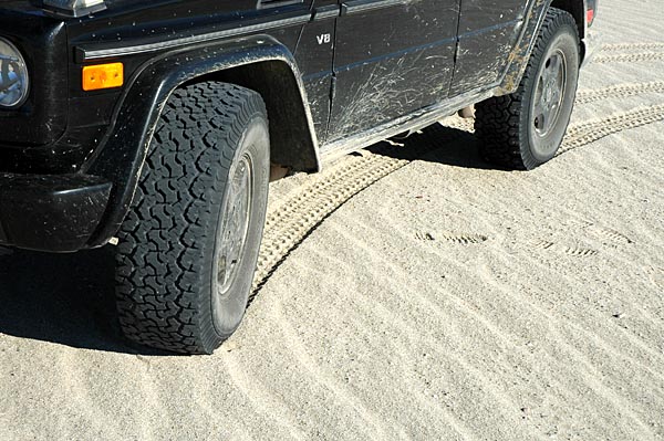 Here is another very valuable tip for driving in soft sand: Drive as straight as possible! Driving straight makes the rear tires follow in the same already compacted sand channel the front tires have created. With the right (low) tire pressure you are just cruising along. By initiating a turn, the rear tires leave that front tire channel and each of them will now create their own rear tire channel and thus will have to fight a small berm of sand in front of each rear tire. That increases the resistance by 100%. Increasing the chance to get stuck. The tighter the turn the higher the resistance. This is valid even when you have deflated your tires to the recommended sand pressure.